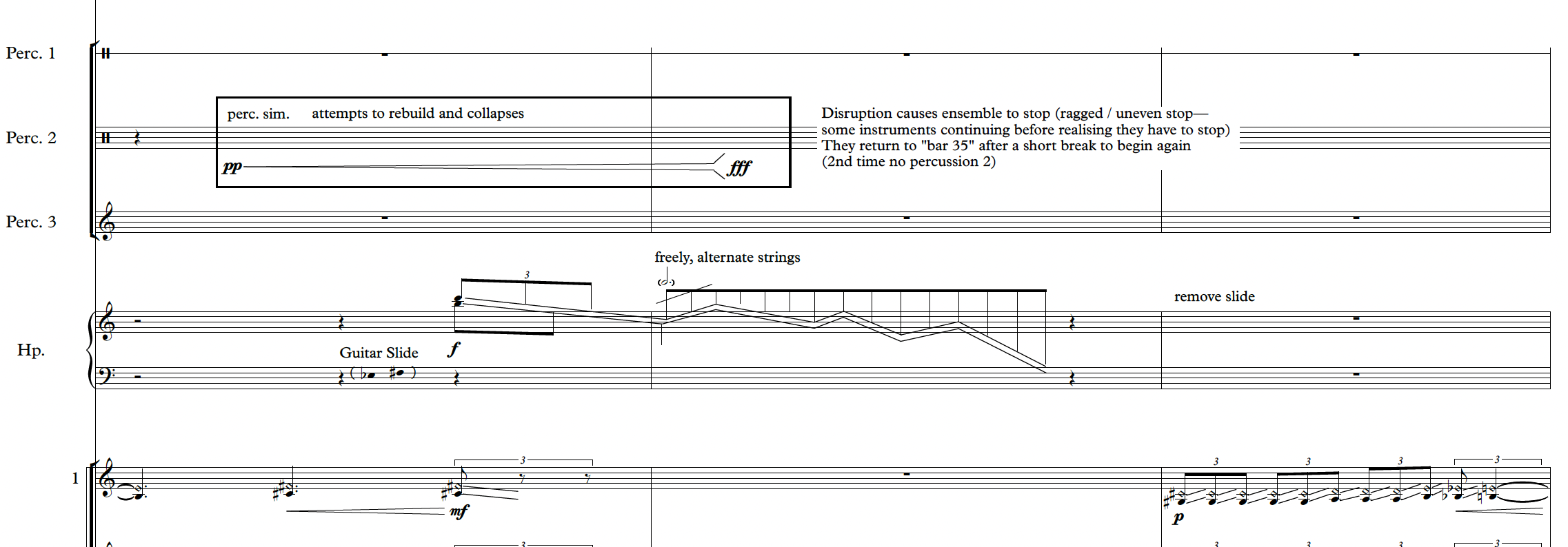 This figure of the teetering, impossible tower being built up and falling is then multiplied compositionally in various ways through types of repetition where the music is tracking back, dropping things, inserting things. A large part of the compositional research revolved around looking for different ways of expressing figures or moments of temporal disruption and alteration.