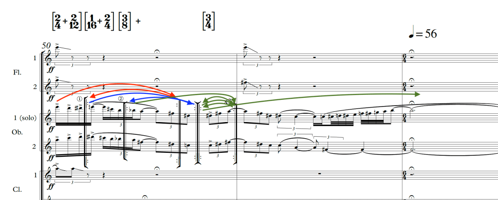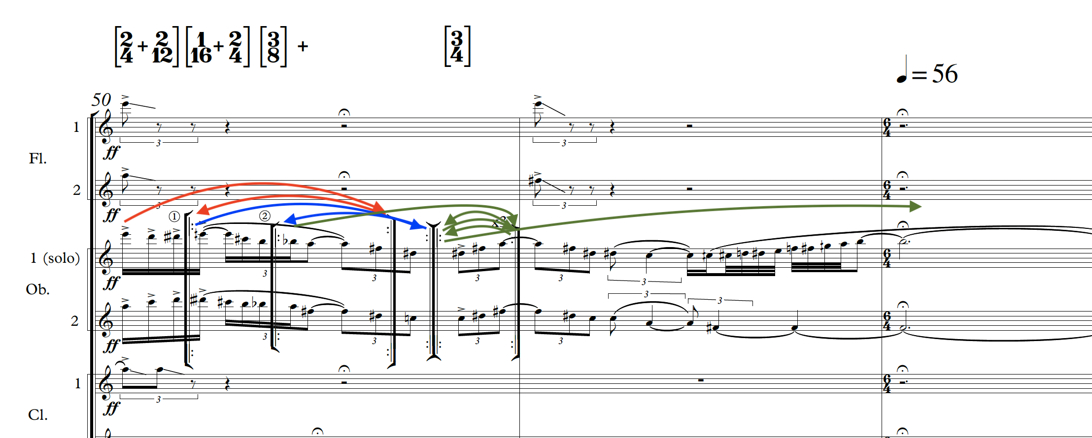 I use repeat brackets to isolate a segment of music or a segment of time, and interweave it with other succeeding segments The coloured annotations, for instance the red lines, show how one reads or travels through the music until one meets an end bracket; one then tracks back to the corresponding bracket which is not at the beginning of the bar. What’s more unusual about this procedure is that instead of taking a chunk of music and repeating it wholesale to create a loop which is what one might normally do with a repeat bar, I interlace the repeats so that one has an incomplete reading of the material. The second loop is blue and again only catches part of the same musical material when it goes back, before going on. The green arrows show a knot moving around a triplet figure three times before moving on.