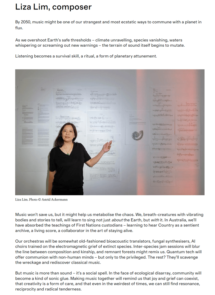 I wrote a little futurist para for Limelight Magazine’s 250th Anniversary issue where they asked a number of musicians to speculate on where ‘art music’ might be in 2050. You can see the various responses at https://limelight-arts.com.au/features/limelight-looking-forward-to-2050-fingers-crossed/